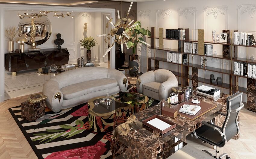 The reflection of personal style, passions, and aspirations of the private client is the motto for this working space. The Supernova Chandelier illuminates this room and the Nougat Desk brings the refined statement that it’s illuminated by the French windows conceiving a perfect place to work.