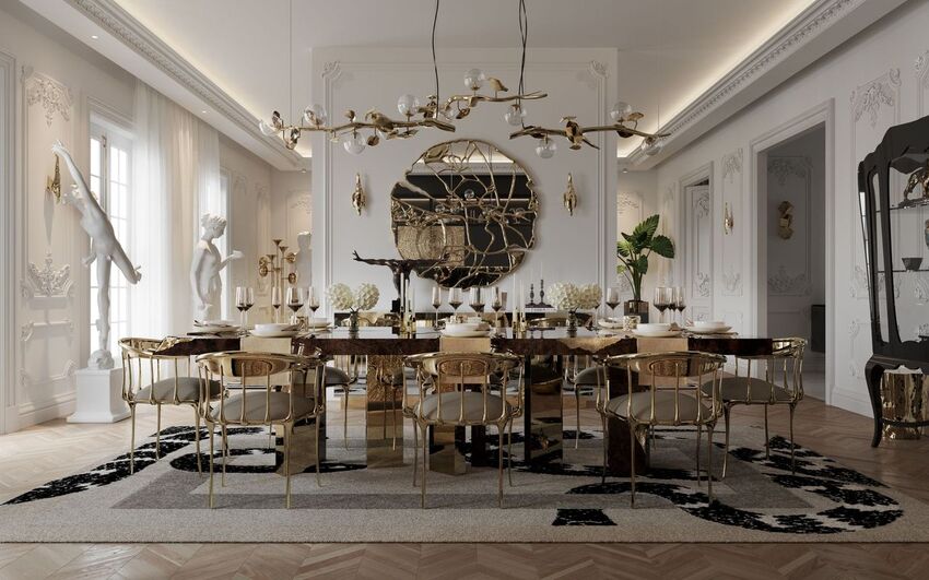 The dining room mixes neutral tones with black and dark brown wood surfaces contrasting with the exquisiteness of gold brass. But what truly elevates this ambiance are the pieces that make this project a living art gallery. The imposing Empire Dining Table with the Glance Mirror and the memorable Nº11 Chair complement this beautiful and perfectly designed area.
