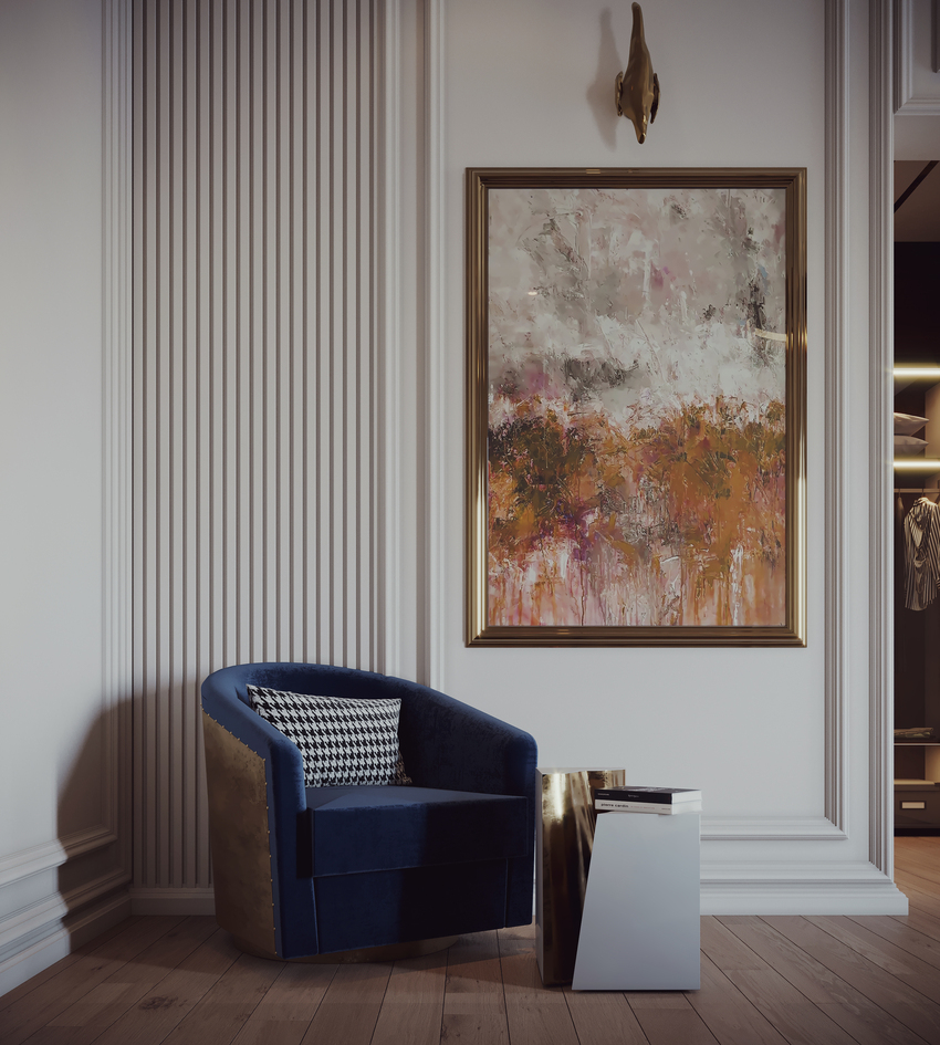 Before going to the closet, there are two finely crafted spaces to look at, the writing desk and the cozy reading corner. The first one, Rukay Armchair by Brabbu, and Carter Table Lamp, from Delightfull, bring a smooth and functional combination, whereas, in the small living area, the navy blue Earth Armchair by Brabbu, Lapiaz Side Table and Soleil Sconce Wall Lamp from Boca do Lobo, enhance the elegance and refinement spirit of the bedroom.