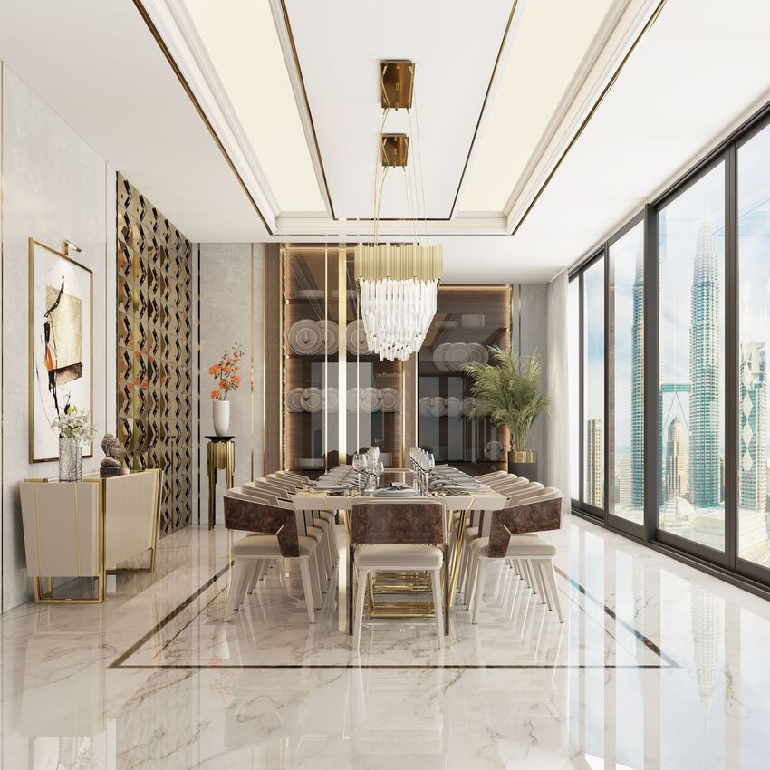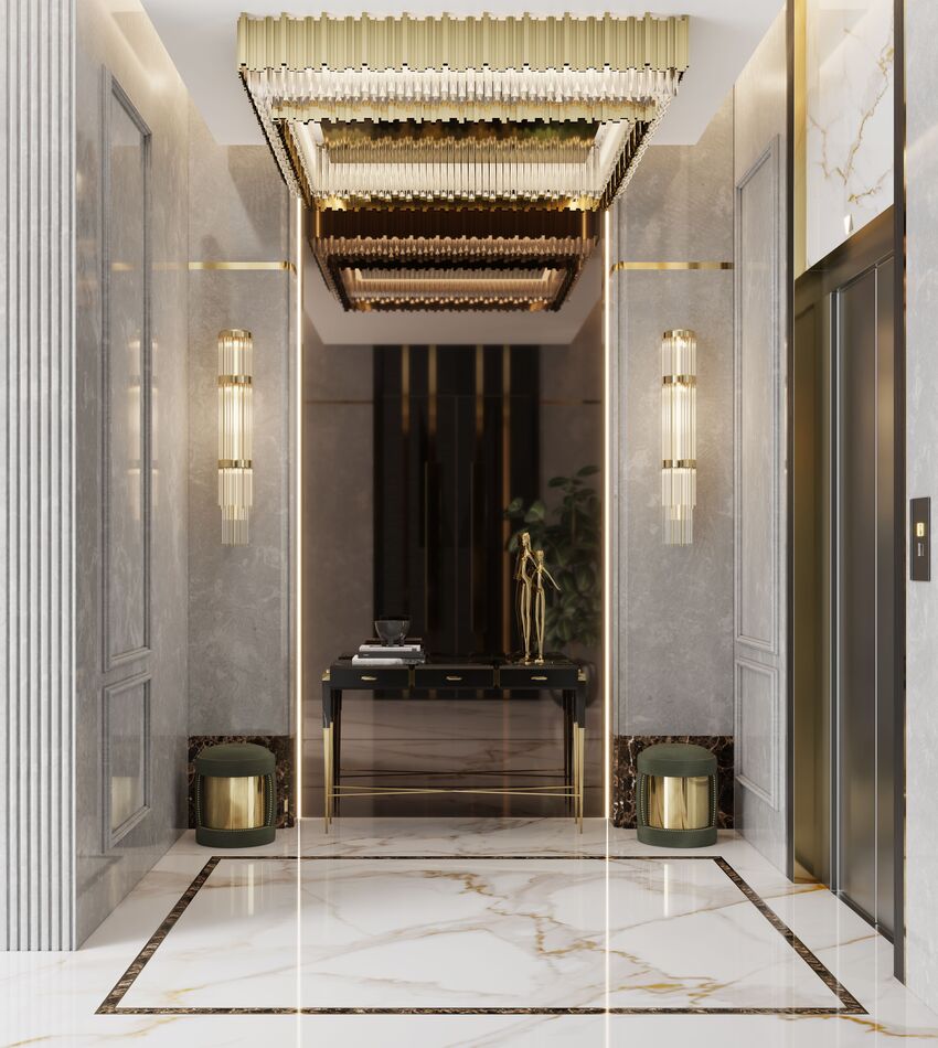 A bright and opulent living room, with generous height, allows the amazing Babel Chandelier to shine freely. The wall’s trumeau provides a classical vibe and the marble floor an elegant feeling. The long custom Senzu Sofa crosses the room and is a pure statement, the Empire Set III Center Table portrays extravagant lines and the Babel Floor Lamp brings the fantasy of detail to reality.