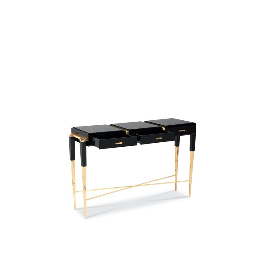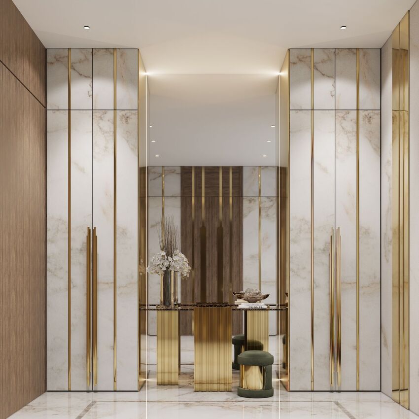 The feeling of luxury that marble and gold-plated brass can provide is almost infinite. Proof of it is this magnificent entryway that breathes from an opulent air exhaled by the magnificent decor. The impressive Spear Console stands with a striking dynamic pose side by side with the custom Armour Stool. The Skyline Door Hardware creates a silhouette when set in context.