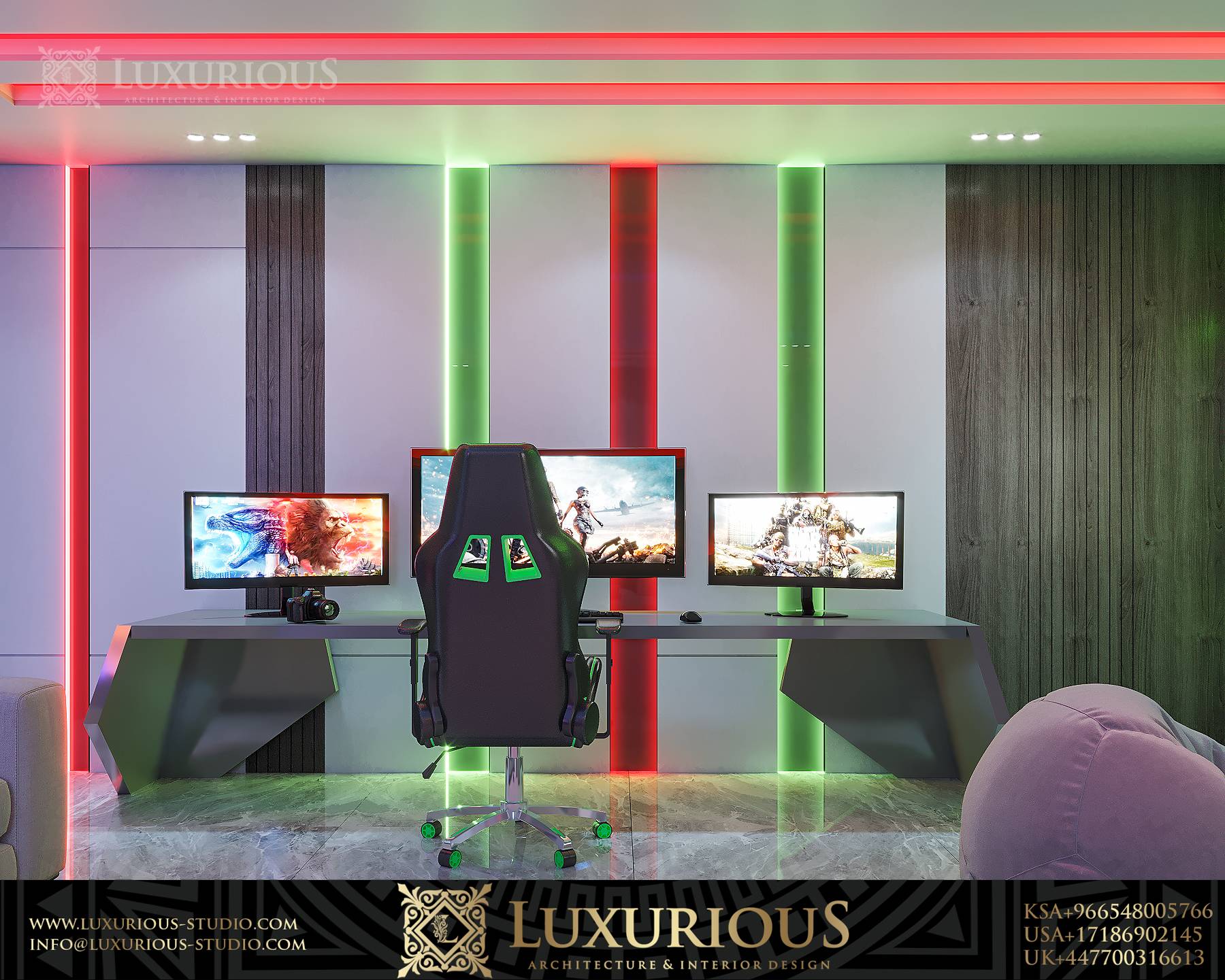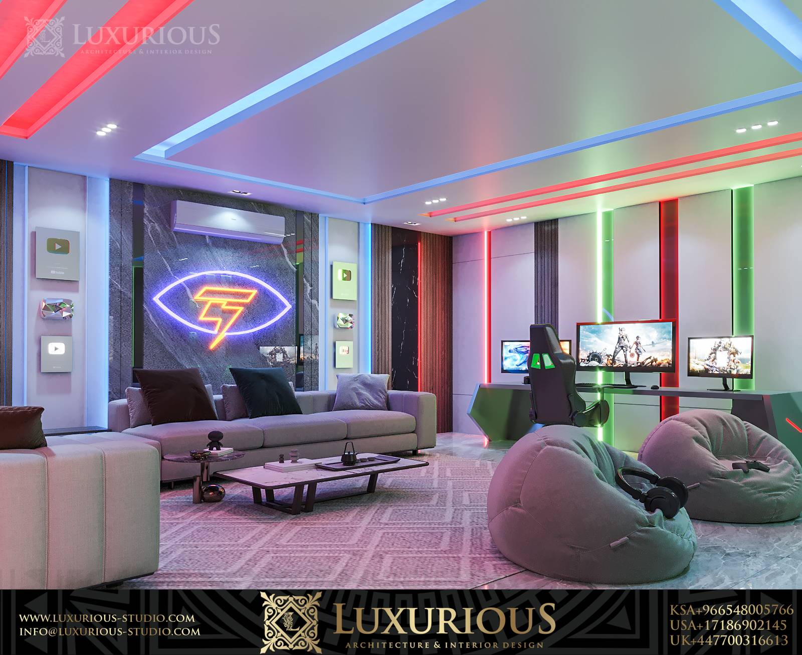 The famous Saudi YouTuber Topz, and after a long search for a suitable design company, Topz contacted us for a special distinctive design for his setup room in which he spends most of his time, as is usual. Our team loves a challenge. After meeting with Topz, the modern, contemporary direction of the design was chosen, adding touches of wood and marble. Natural on the walls to extinguish more of the feeling of nature. Some golden steel was added to all the prominent corners in the room. The doors were made with high craftsmanship from natural wood. The lighting was studied very carefully, as there is more than one lighting mode. The first mode is daytime spot lighting. The second mode is the smart LED light that can be changed to any color of your choice. The third mode is the neon light designed from the Topz logo. Room control is linked through Amazon Alexa.